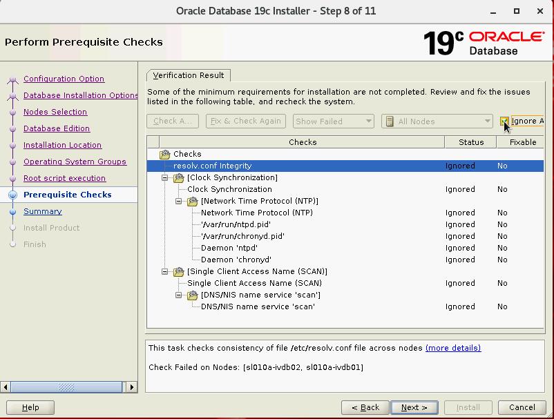 一些NTP、DNS和SCAN相关的检查失败,都是预期之内的情况,之间忽略即可。
