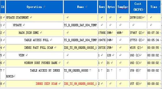 通过执行计划可以看到,对Cost影响较大部分为IDX_TS_UH_ORDER_GOODS_1表的索引跳扫,Cost值157,虽然只有157,但是对走索引来说,157的Cost已经很大了,如果正常索引扫,这个值会小很多,而且INDEX SKIP SCAN的结果和HASH JOIN SEMI循环,导致总Cost达到287M(100),如果能将索引跳扫的Cost从157降下来,INDEX SKIP SCAN的结果和HASH JOIN SEMI循环的总Cost就会成几何下将,这个SQL优化重点也是使索引跳扫改成正常索引扫,猜测产生索引跳扫的原因可能是IDX_TS_UH_ORDER_GOODS_1表上存在复合索引,而该表的ORDER_ID列不是复合索引的第一列,解决方法:在IDX_TS_UH_ORDER_GOODS_1表的ORDER_ID列上单独建立索引。