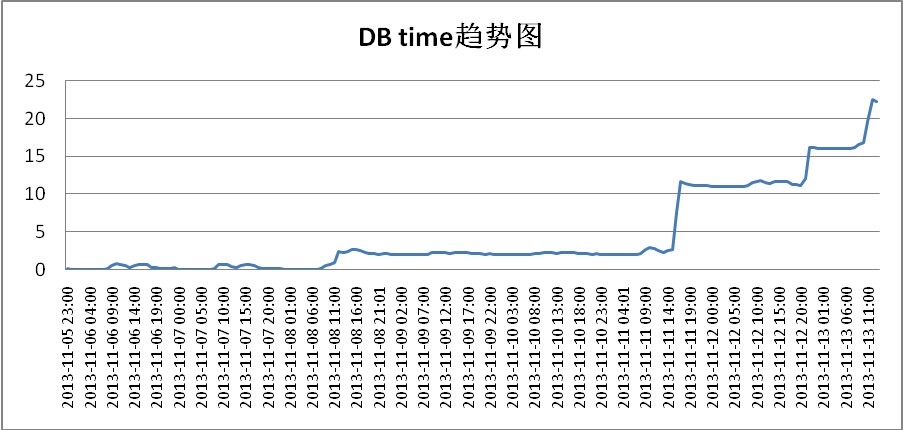 某客户有30多套数据库要整合,在调研客户需求的时候,客户说有几套库负载比较大,在检查之后发现,这几套库根本就不忙,但是其中有一套库引起了我的注意,下面是这个库的DB time趋势图。