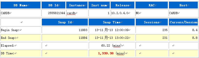 很奇怪的是,客户的库在11月8号之后,DB time成直线上升,这很奇怪,11月8号之前DB time都很低,为什么在11月8号之后,DB time就一直没降下来?出于对客户负责和好奇,追查了一下到底是什么在作怪。取了最后时间点的AWR报告,下面是AWR简要信息。