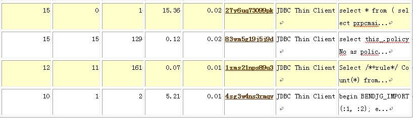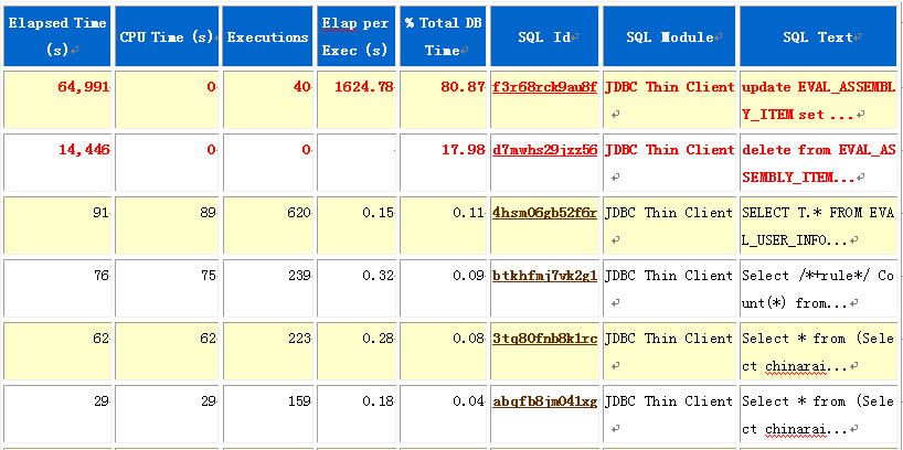 其他等待事件都不严重,只有这个行级锁,占总体等待时间的98.9%,基本可以断定就是这个行级锁在作祟,怎么定位是哪个会话或哪个SQL导致的行级锁呢?如果不会查的话有个最简单的方法,就是使用ADDM工具,生成该时段的ADDM报告,一目了然。在看ADDM报告之前,先看下这个报告按执行时间排序的SQL。