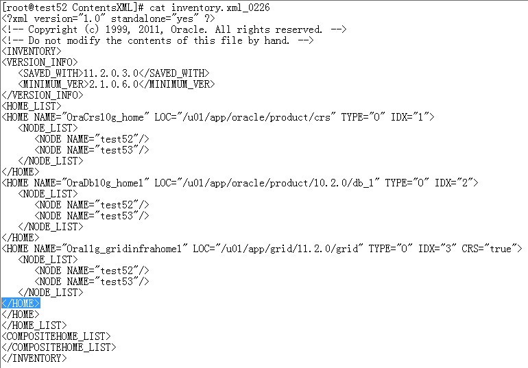 上文我提到是重装11.2.0.3.0版本的数据库软件,那么在重装之前就有删除的过程,当所有文件都删掉之后,oraIncentory文件里面记录的相关信息也要删掉(该服务器还有其他版本的数据库和集群件,所以这个文件不能删),但是在清楚oraIncentory文件信息时,少删掉一行,这样ORACLE就解析不了这个文件,抛出上面的错误,将多出的一行删除后,问题解决。