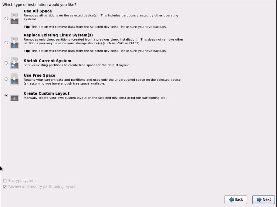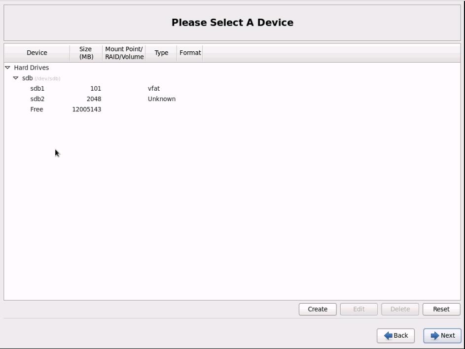 接下来按Ctrl+Alt+F6,返回图形界面,这时,图形界面还停留在文章开头的图片显示的位置,分区信息并没有同步到这个界面,按后退按钮,到下图位置,选择定制分区。