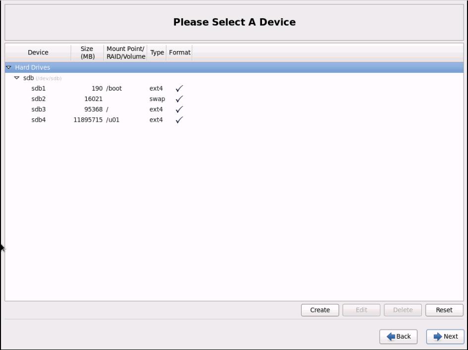 然后点击下一步,正常安装系统即可。安装完成后,使用df –h命令可以看到分区的信息。