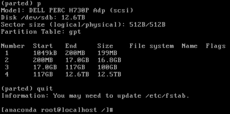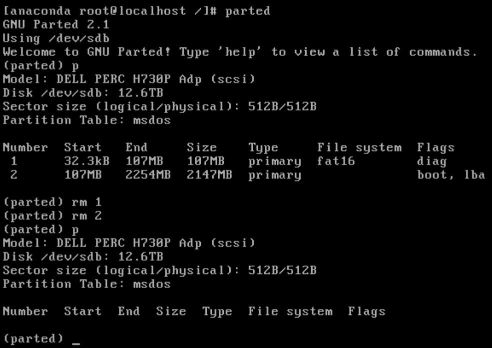 在这个界面,按Ctrl+Alt+F2键,跳转到命令行终端,然后登入parted命令 (因为我这个服务器所有的磁盘只做了一个RAID,所以对操作系统来讲也就相当于只有一块盘,如果有多个磁盘,比如sda、sdb、sdc那么,这里需要使用select命令来确定要操作的磁盘),输入p回车,可以看到上图的两个分区,这两个分区都是MSDOC格式的分区,使用rm命令删除这两个分区。