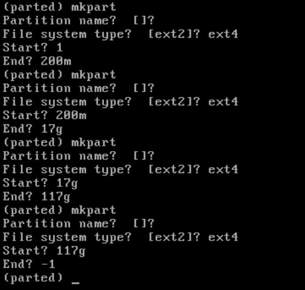 上图一共分了4个分区,一个200M的用作boot分区,一个17G的用作swap交换分区,一个100G的用作跟分区,最后一个是把剩下的所有空间都分给这个区,大约12TB,用作u01分区。但是需要注意的是,parted不是根据1024换算的,是按照1000换算的,也就是这里面看到的200M、17G等大小,其实要比200M和17G小不少。