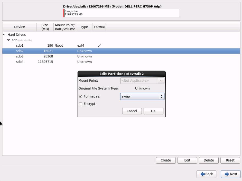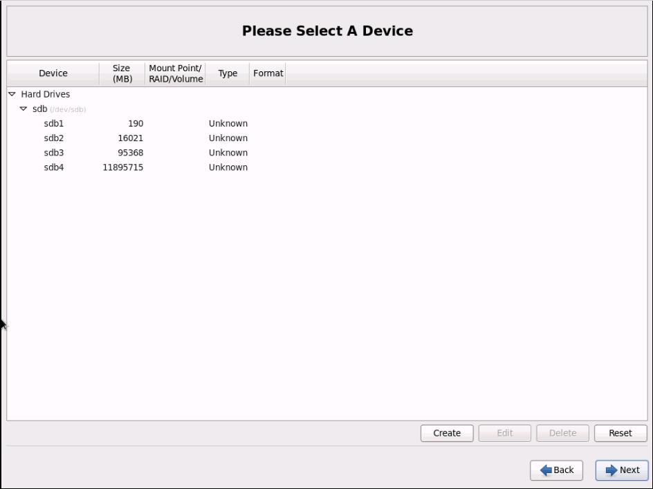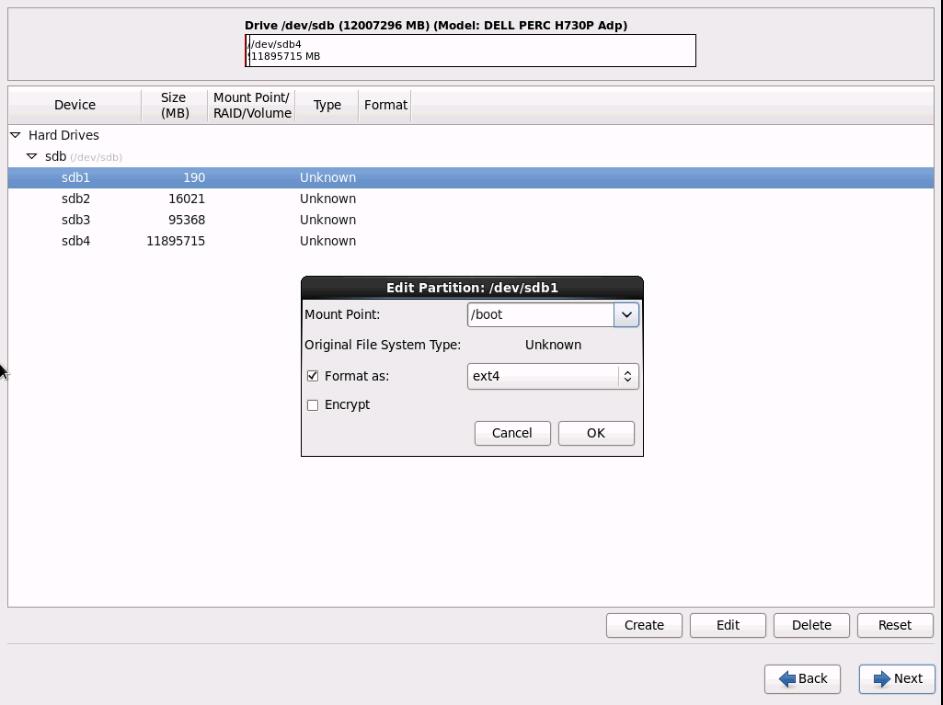然后点击下一步按钮,就可以看到这4个分区了,但是这时,这4个分区的挂载点和文件系统并没有设置,需要点击编辑按钮进行设置。