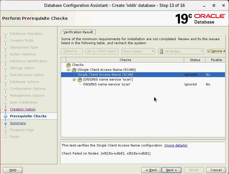 先决条件检查,因为安装的时候没有使用DNS及只使用了一个SCAN IP导致这两处没有通过,忽略即可。